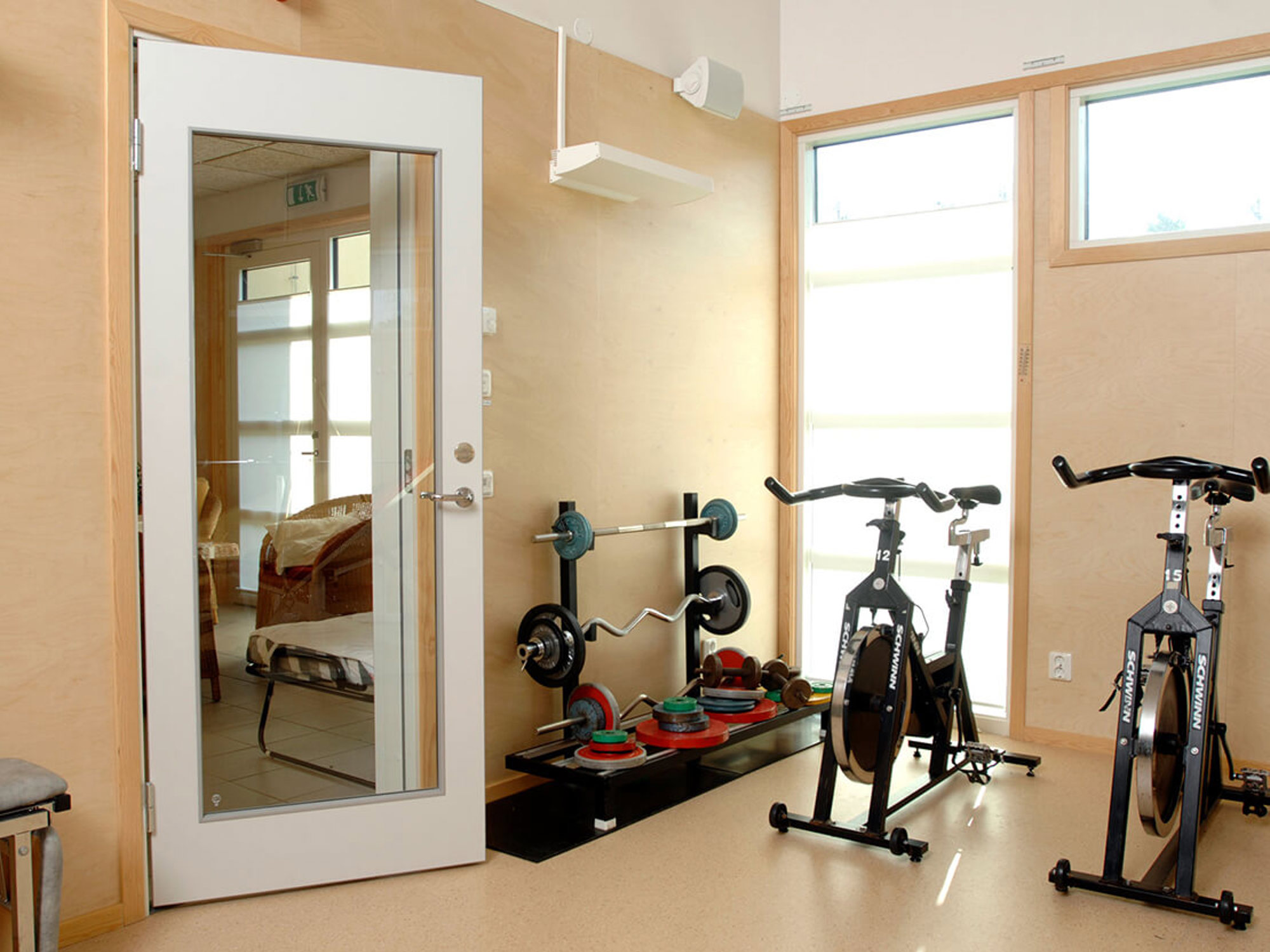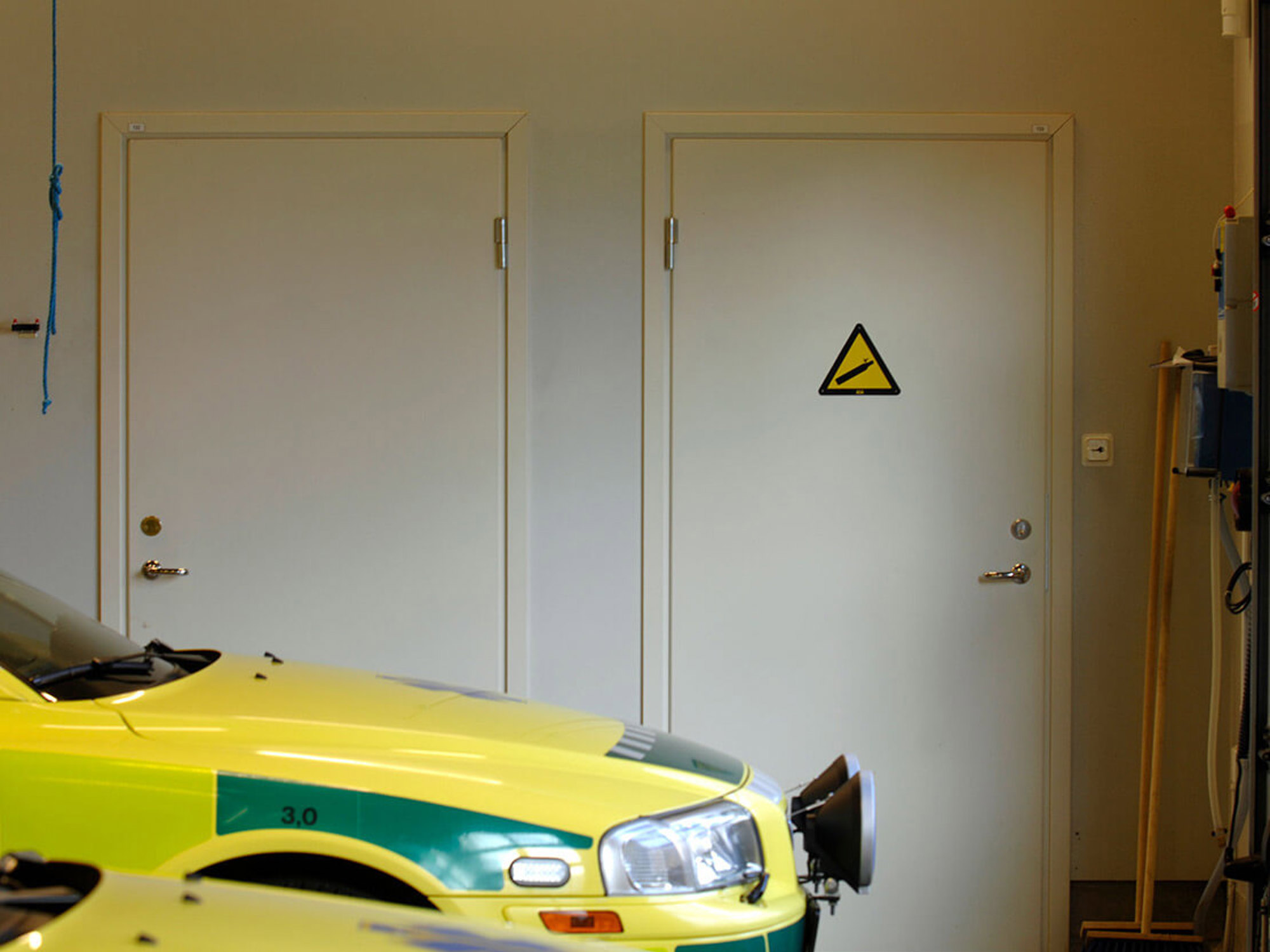 Ambulansstationen har en blandning av funktionsanpassade stål- och trädörrar i olika utföranden.