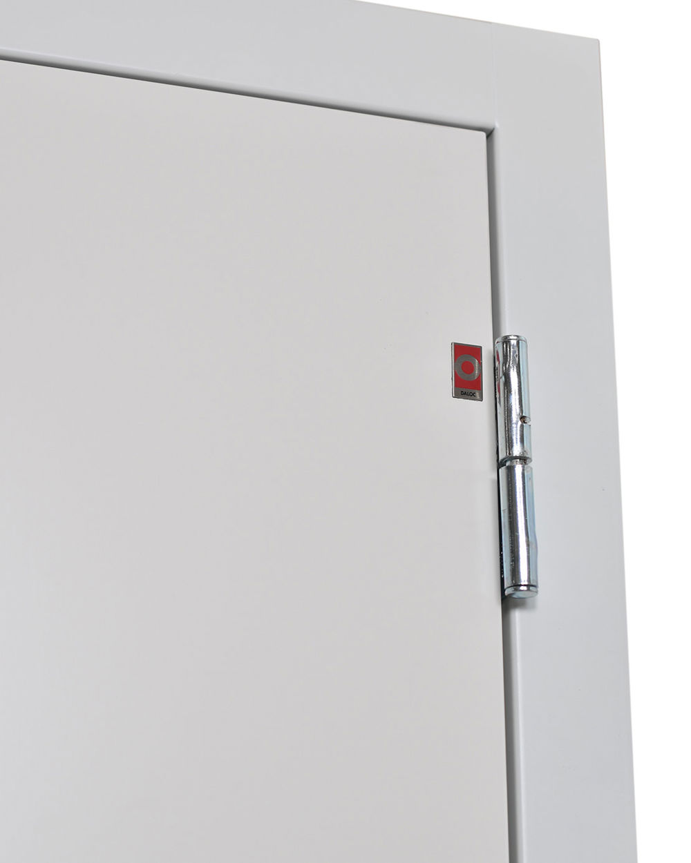 Luckbladet är 48 mm tjockt och tillverkas av förzinkad stålplåt med isolering av mineralull. Luckans stålkarm har fast foder på gångjärnssidan och levereras sammansatt för skruvinfästning i vägg.