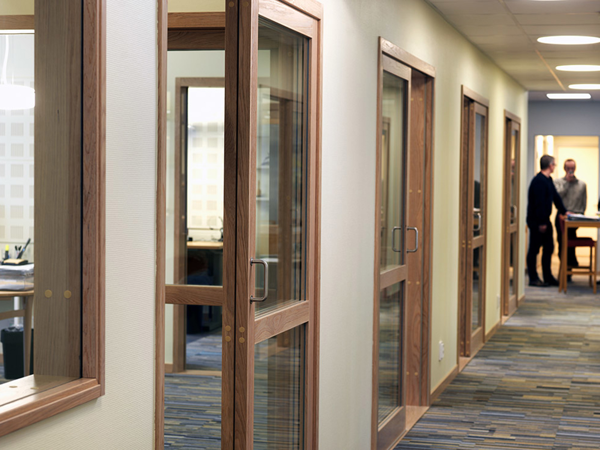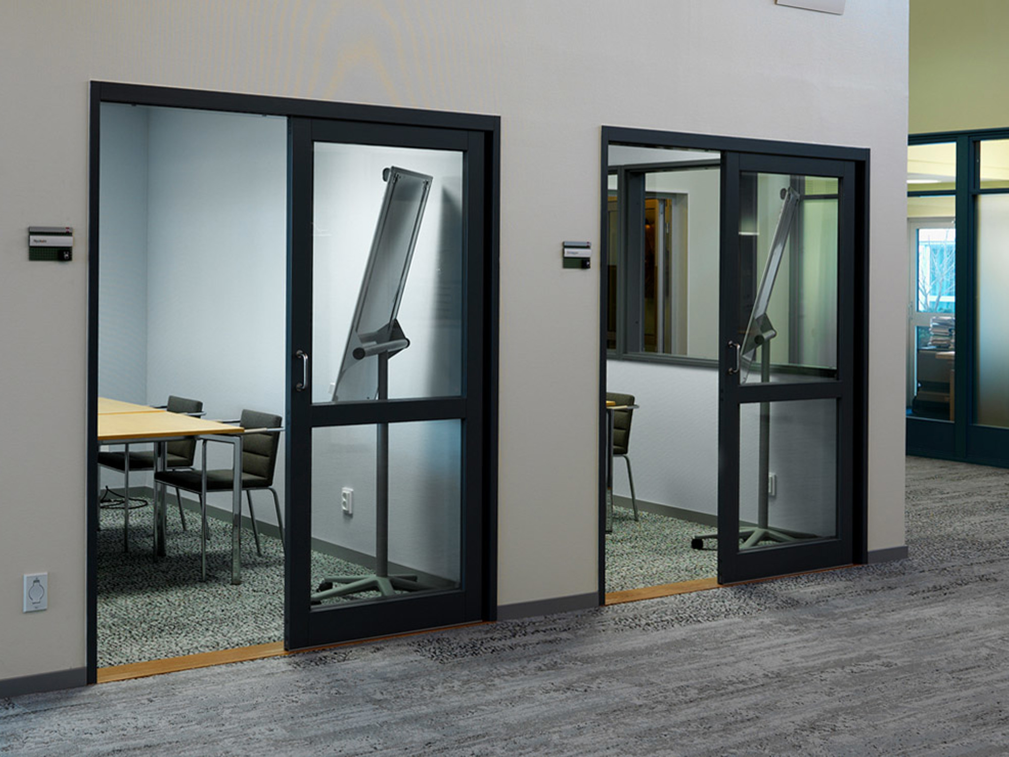 Enskildhet och arbetsro på ena sidan. Öppenhet och elegans på den andra. Skjutglaspartier är ett bra alternativ till slagdörrar i kontor och offentliga miljöer.